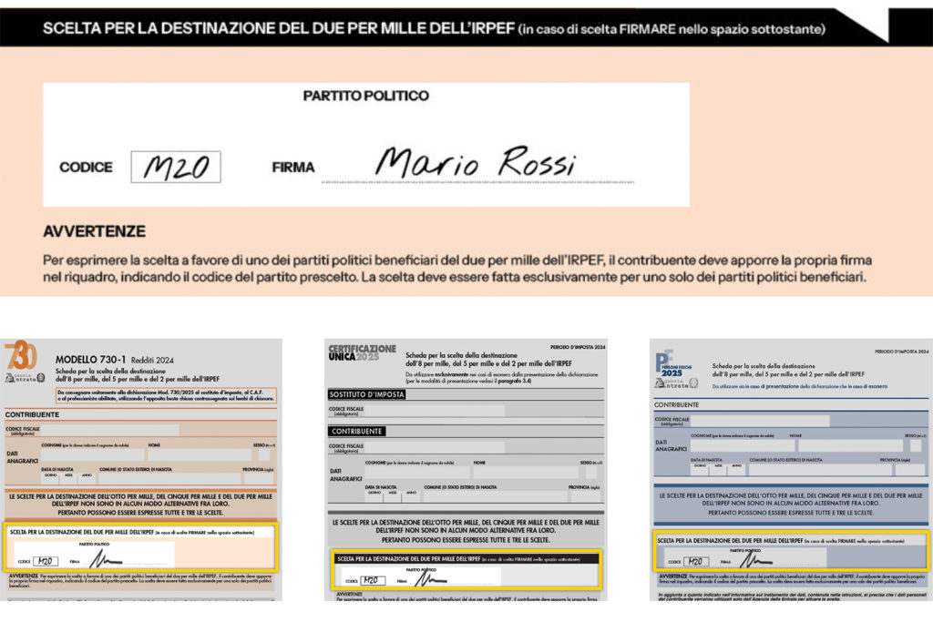 Scrivi M20 nello spazio dedicato al 2×1000 della tua dichiarazione dei redditi e firma accanto.